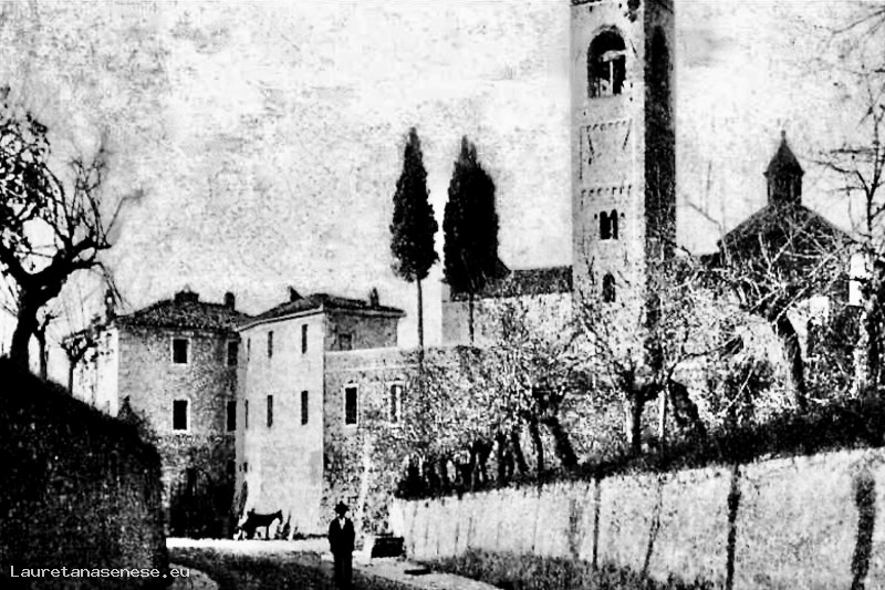 In questa foto, solo apparentemente analoga a una precedente, si nota con chiarezza l’esistenza del nuovo edificio destinato ad Asilo Parrocchiale. Inoltre, la presenza di un cavallo vicino alla Porta testimonia la presenza della bottega di Maniscalco di Angiolino Neri, padre di Gostino. Da notare anche il fontino per abbeverare gli animali da tiro. Inoltre, c’erano ancora i cipressi che limitavano l’antica area cimiteriale.