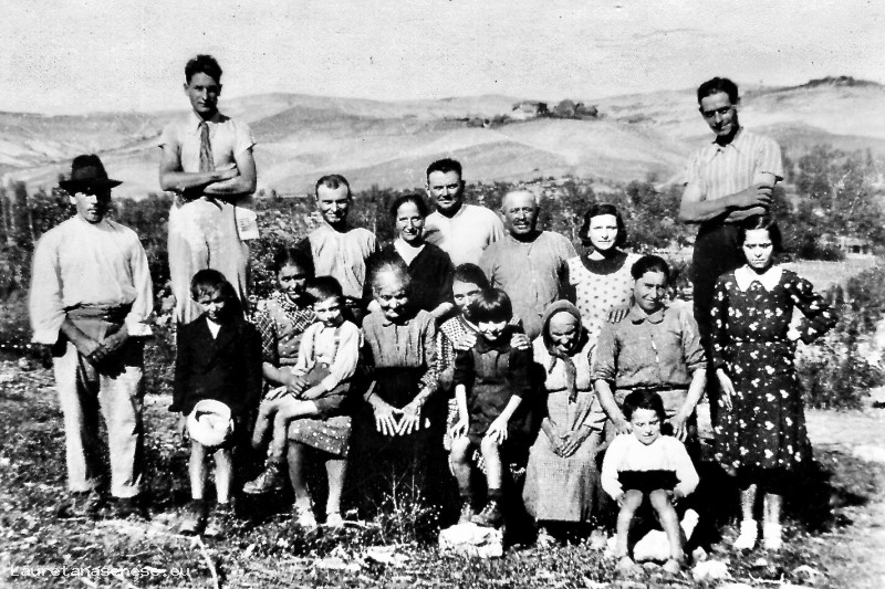 La famiglia Boccini al completo quando facevano i contadini a Torrentino, podere vicino all’Ombrone e raggiungibile dalla strada che porta a Monte Sante Marie. La foto dovrebbe esser stata scattata dopo la trebbiatura del 1938, forse per festeggiare un’annata di buon raccolto.
