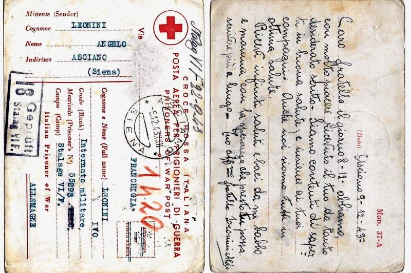 1943, 9 Dicembre - Cartolina a Ivo prigioniero in campo di concentramento Asciano