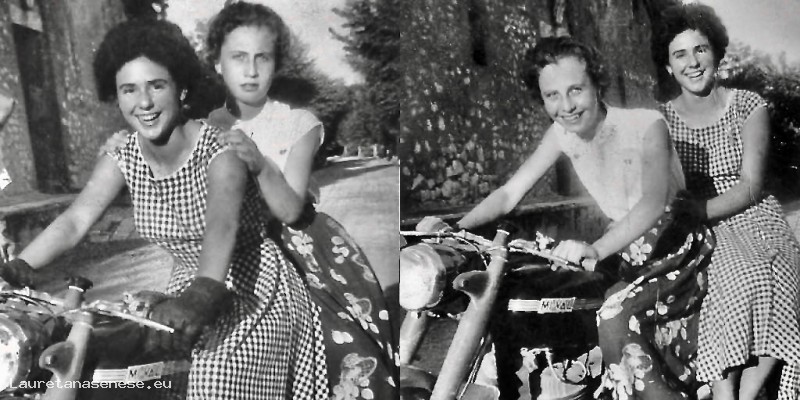 Le due grandi amiche e coetanee: Marcella Soldati e Renata Mencarelli in sella a una moto MI-VAL 125 T sulla strada per Monteroni, davanti a Segole.