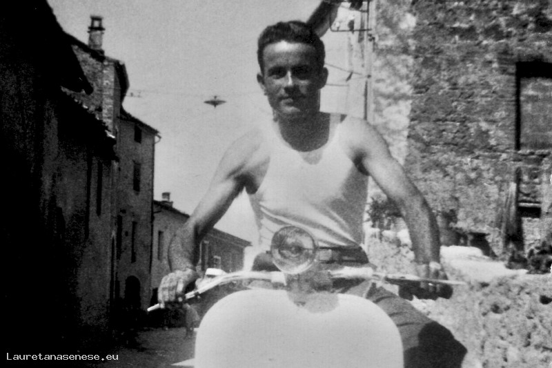 Un giovanissimo Serafino Meoni si è fatto fotografare alla guida del suo nuovo mezzo di trasporto: una fiammante Vespa Piaggio, che allora era un oggetto molto ambito, di auto private ne giravano proprio poche.