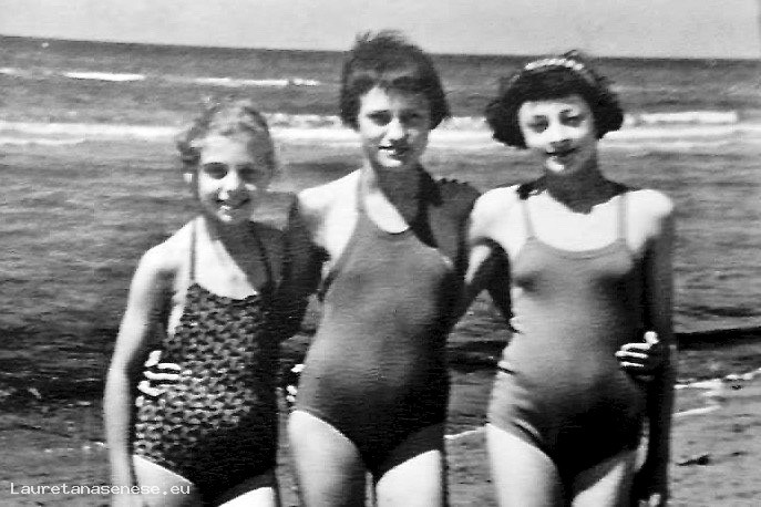 Foto che ritrae tre bambine in piena pubertà, insieme al mare con la colonia a Follonica, organizzata dal CIF: Centro Italiano Femminile, organizzazione emanazione cattolica.
