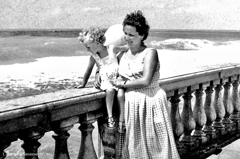La piccola Maura Giannetti sulla balconata della "Terrazza" di San Vincenzo, guarta il mare mosso, tenuta saldamente dalla mamma: Graziella Braconi.