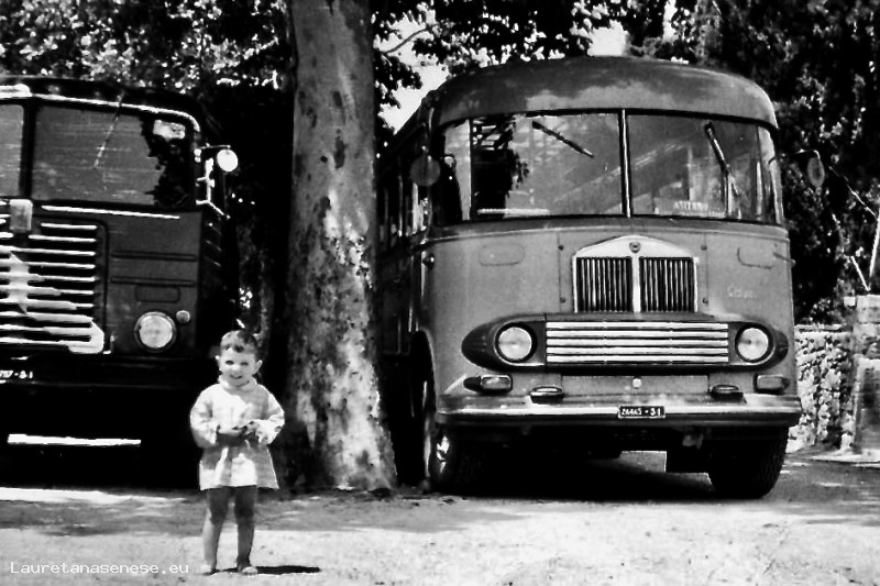 Il piccolo Alberto Coradeschi davanti alla casa costruita dal babbo Angiolino, fra lo Stadio Marconi e il Palazzo, è ritratto davanti a un grosso camion corredato da due vetri piatti; all'epoca i parabrzza curvi non erano diffusi per il loro alto costo. Si trattava del mezzo guidato dal babbo di Fabio Guerrini e proprietà della cava "Paradiso"; era parcheggiato vicino al macelli perché, la mattina presto, il Guerrini doveva arrivare fino a Roma per le consegne di manufatti in travertino.