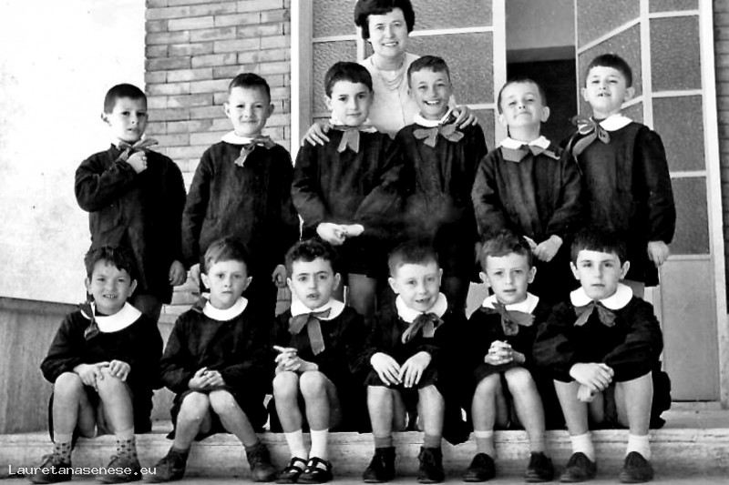 Insegnante: Elena Landi Alunni: Andrea Mencarelli, Leonello Dominici, Spartaco Meoni, Nevio Falcai, Massimo Giusti, ? Panarese, Marco Salvi, Rodemo Galli, ? Leonardi, Gianfranco Trapassi, Luciano Romi, Isaldo Boscagli. Luogo: Asciano, Scuola Elementare di via San Francesco, scala di accesso sinistra