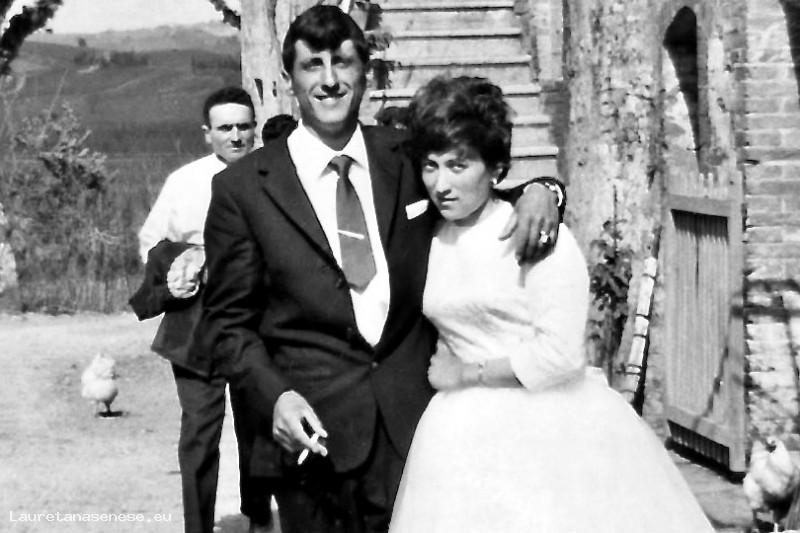 1964, 25 Aprile - Gli sposi nell'aia dopo il pranzo Asciano
