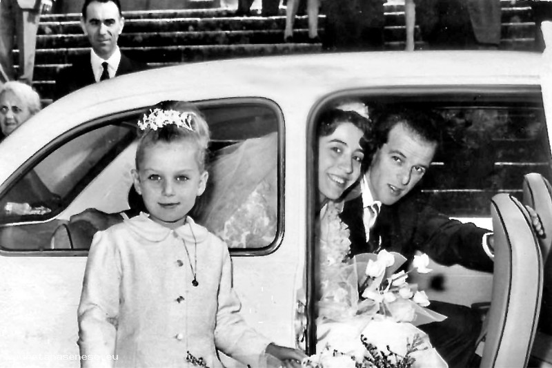 Ad attenderli in fondo alla scalinata della chiesa un'utilitaria con motore posteriore, FIAT 850, tirata a lucido per l'occasione.