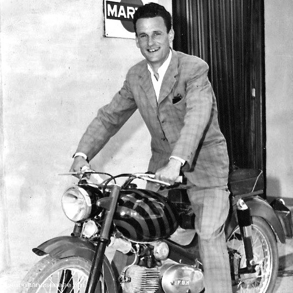 Valdemaro Giusti, appassionato tifoso di calcio, a cavallo della sua moto (Benelli?) con il serbatoio dipinto a strisce nere e blu.