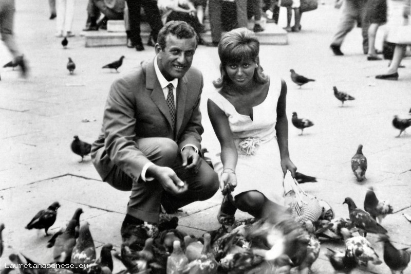 Il viaggio di nozze ebbe come meta Venezia. Qui la bellissima coppia è ritratta in Piazza San Marco, mentre distribuisce mangime ai famosi piccioni proprio davanti alla omonima basilica.