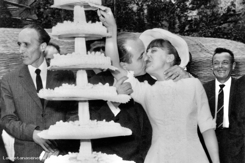 Marcello approfitta del tentativo di taglio della gigantesca Torta per affibbiare un grande bacio alla sposa Anna Moscatelli.