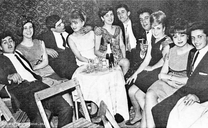 Questa bella foto ritrae un gruppo di amici intorno ad un tavolo con sopra una bottiglia di spumante, durante i balli di carnevale che si svolgevano al Teatro Ravvivati.