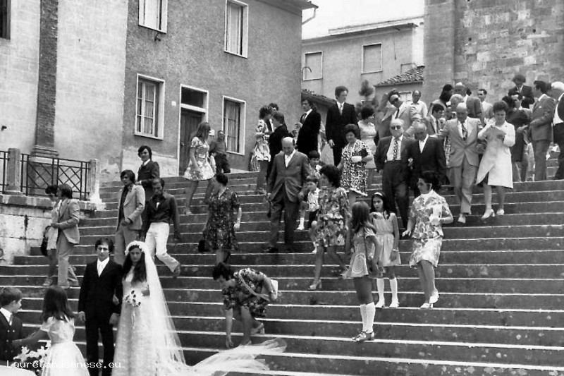In fondo alle scale della chiesa con gli invitati che seguono gli sposi, fra i quali si riconoscono: il Galassi ex vigile urbano e la moglie di suo figlio, sorella dello sposo.