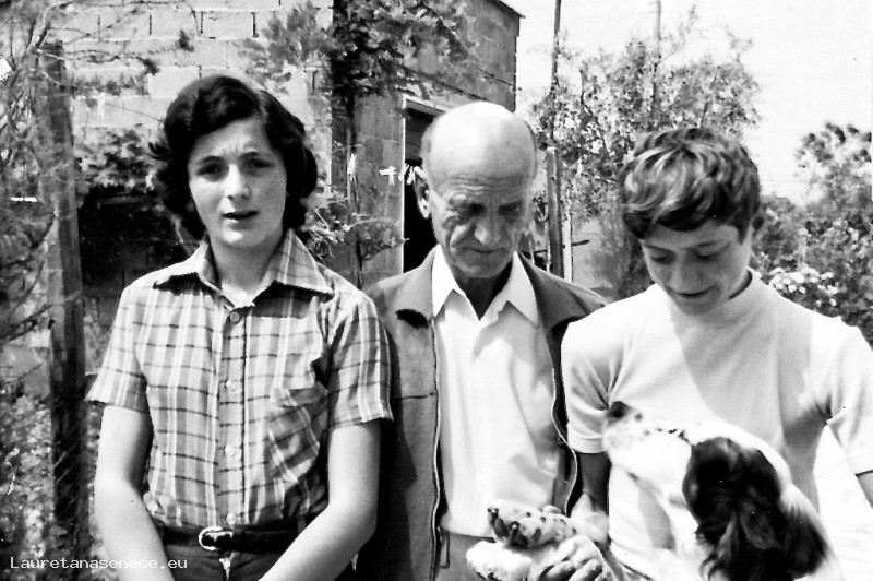 Palmiero Moscadelli, meglio conosciuto come il fattore della Pievina, in mezzo ai gemelli adolescenti: Nella e Sandro, con il cane di famiglia che vuol far parte del gruppo.