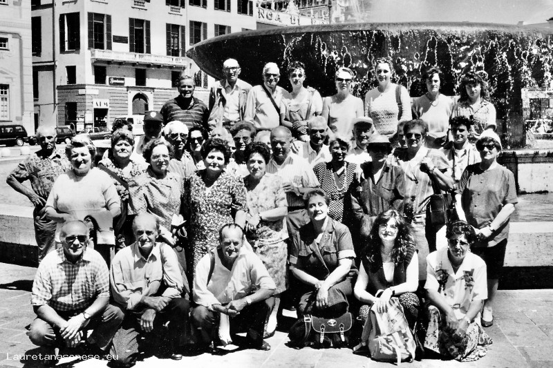 Tanti ascianesi in piazza De Ferraris a Genova, si fanno fotografare davanti alla grande fontana.