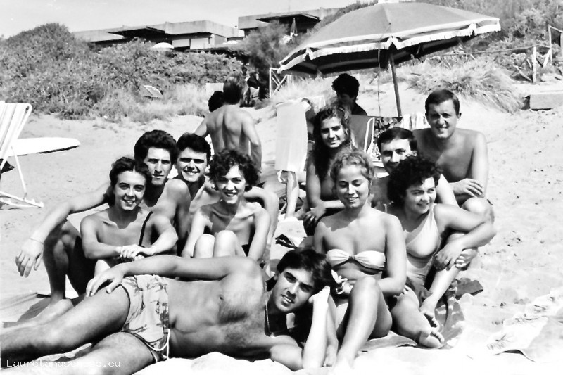 Gruppo di amici insieme al mare, presumibilmente a Castiglione della Pescaia, sulla spiaggia a sud del porto canale: