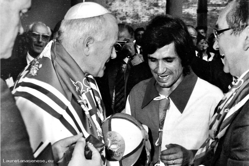 Nel corso della visita papale al Santuario di santa Caterina, Andrea Degortes detto Aceto regala, al Papa Giovanni Paolo II, lo "zucchino" con i colori della Contrada.