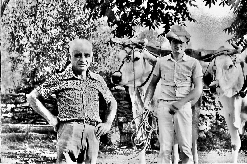 Il Chiodini, agricoltore appassionato del proprio lavoro, è ritratto assieme al figlio Claudio, attuale gestore con il fratello del Consorzio Agrario locale, e due magnifici esemplari di razza chianina, aggiogati.