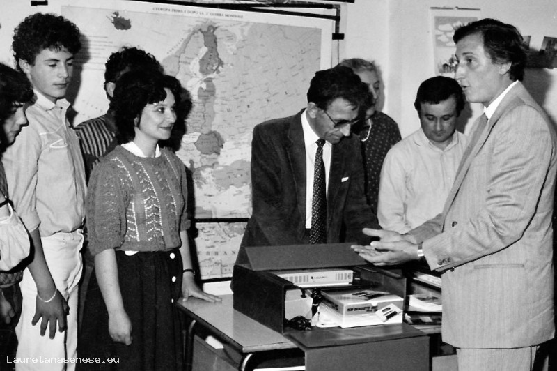 Consegna di uno dei primi Personal Computer, presumibilmente un Commodor 64, alla Scuola Media di Serre, come premio per un concorso vinto. Sono stati riconosciuti: Annarosa Castellani, professoressa di lettere Silvio Cini, professore di matematica Pina Tiezzi, preside delle Medie di Asciano-Rapolano.