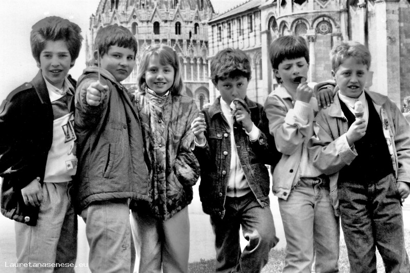 Gruppo di scolari in gita scolastica a Pisa, qui ritratti in Pizza dei Miracoli.