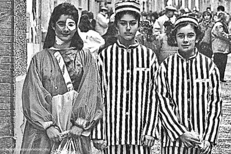 Gruppo di ragazze in maschera al Carnevale di Meio. Più precisamente davanti al portone del palazzo Stella, di fronte a via Santa Maria.