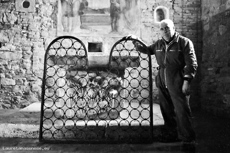 Fu così che Pietro si occupò con grande passione di riparare o costruire, in maniera tradizionale, oggetti in ferro battuto. Nella foto, Pietro mostra con legittimo orgoglio la nuova inferiata, da lui realizzata per la finestra della chiesa dei SS. Jacopo e Cristoforo a Montecalvoli.