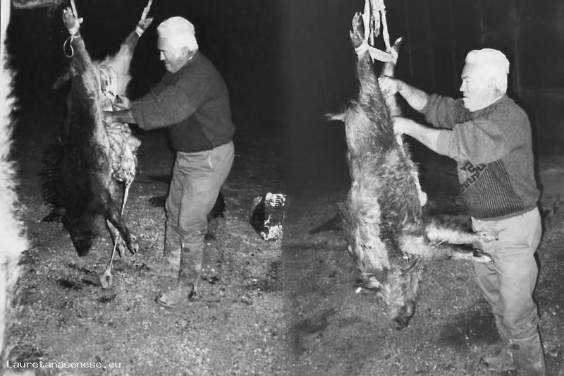 Azeglio Machetti, Guardiacaccia della tenuta La Campana, intento a squartare un cinghiale appena catturato.