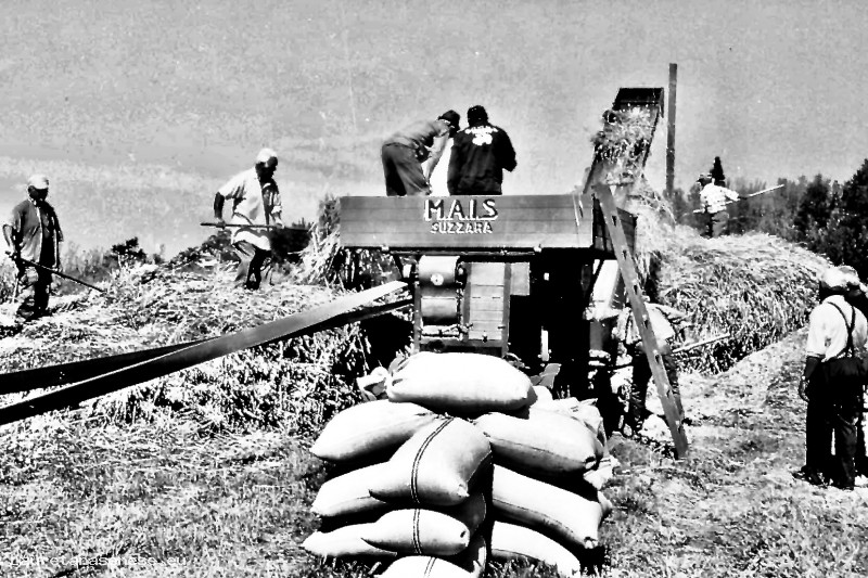 Questa bella foto ci è stata fornita da Alfio Machetti, l'uomo con i capelli bianchi alimenta la trebbia con un forcone.