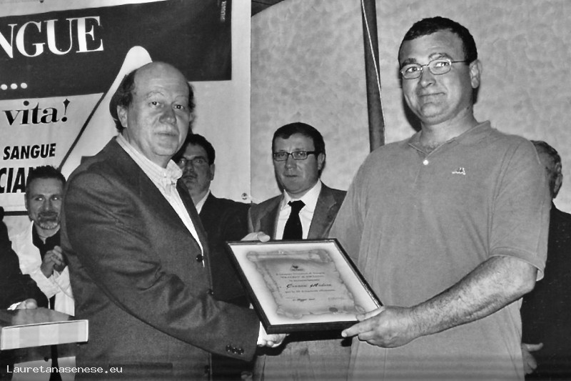 Andrea Cannoni è premiato da un esponente nazionale dei Donatori.