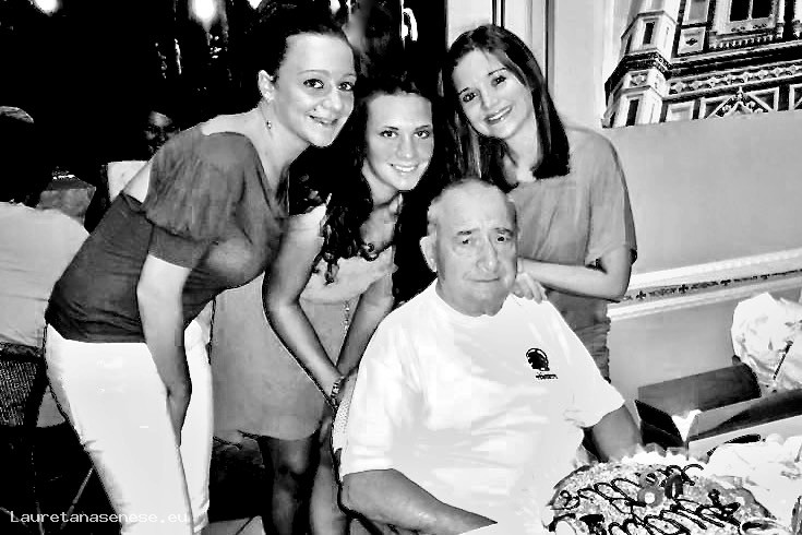 Sandro Fratagnoli, visibilmente emozionato, viene festeggiato dalle tre belle nipoti: