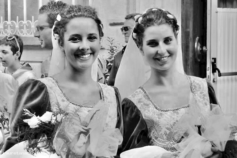 Due ragazze appartenenti alla Contrada del Prato, pronte per sfilare nel corteo storico che precede il Palio dei Ciuchi: