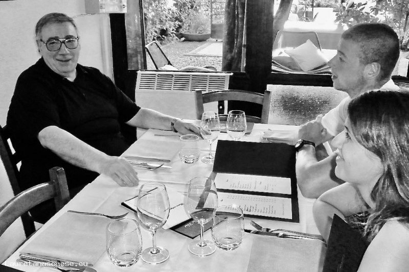 Il locale Parroco don Luca Bonari, in compagnia di due giovani suoi conoscenti, a pranzo sotto la "Parata" del Ristorante La Mencia.