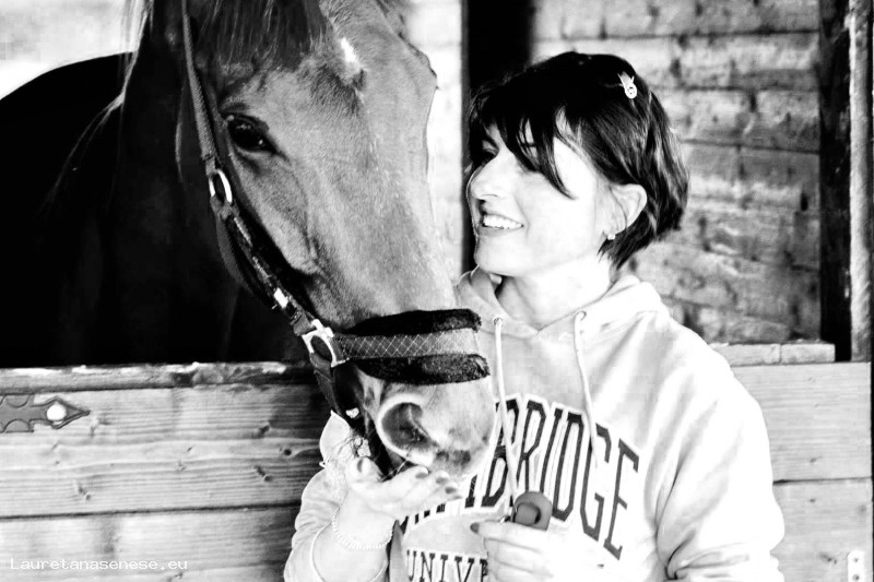 Sara Donati, evidentemente appassionata di cavalli, porge uno zuccherino all'animale.