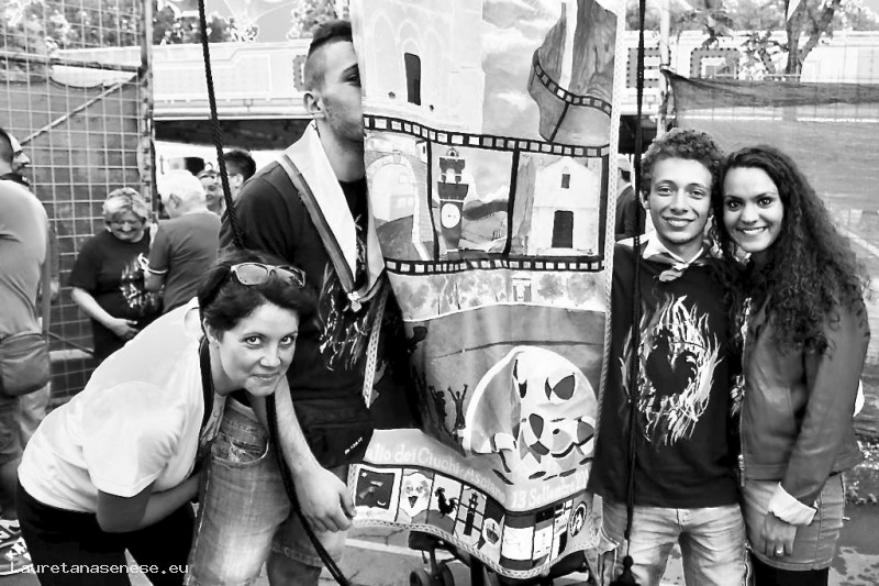La contrada del Prato ha appena vinto l'annuale Palio dei ciuchi e i contradaioli fanno a gara a farsi fotocrafare accanto al "cencio" appena conquistato.
