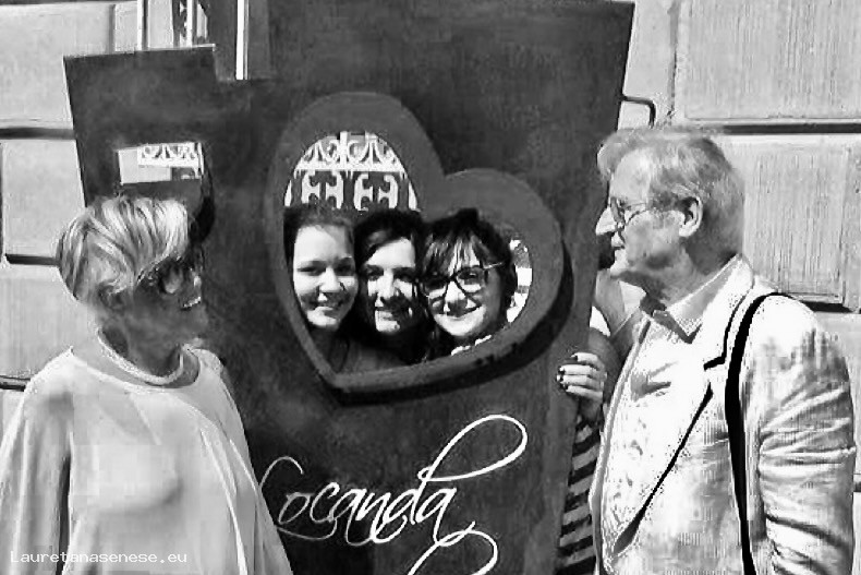 Il nonno Marcello Bazzotti e la nonna Elena all'uscita dal ristorante Amordivino assieme alle nipoti: