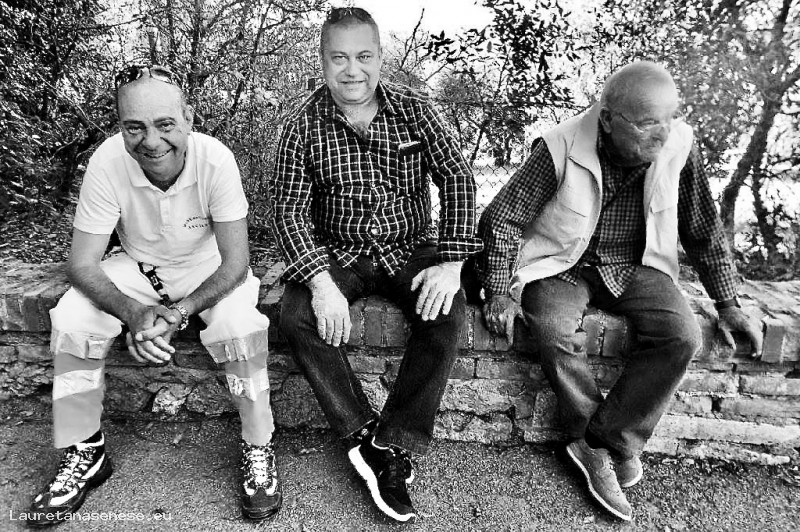 Tre volontari della Misericordia di Asciano seduti sul murello della piazzetta di San Francesco, in attersa di un servizio di trasporto ammalati.