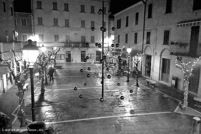 Foto surreale di una piazza deserta per il mal tempo ma arricchita con le luci delle feste e un albero di Natale veramente originale.