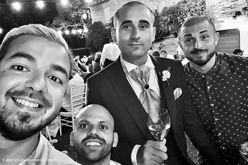 Gianluca Valentini, il giorno del suo matrmonio, che brinda al tavolo degli amici: