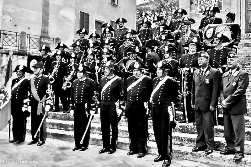 Si tratta della Fanfara Storica dei Carabinieri, qui ritratta sulle scale di Sant'Agata in compagnia di due ex carabinieri locali: