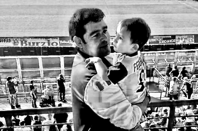 In braccio al padre Alberto, il piccolo assiste alla partita di calcio Torino - Cagliari.