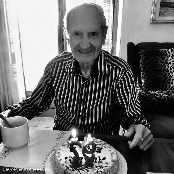 Enzo Cantelli in buona salute, festeggia il su novantasettesimo anno con una tazza di caffè e latte, ma anche con una bella torta.