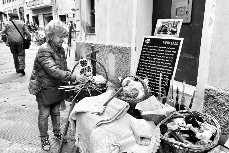 Concetta Tinagli si presta con impegno a rappresentare la Merciaia, esponendo anche prodotti di sua proprietà realizzati con l'uncinetto.