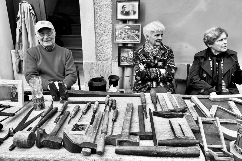 Giorgio Francini, in compagnia della moglie e della signora che ha assistito amorevolmente Sirio nei suoi ultimi mesi di vita, espone sul banco i suoi attrezzi da Falegname, ereditati dall'attività artigianale di Sirio e Quirino, prima che la traformassero in piccola attività industriale.
