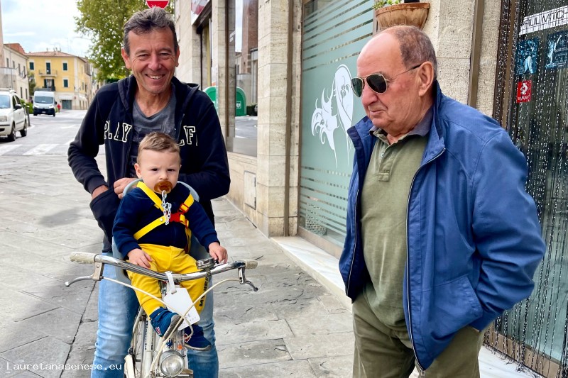 Nonno Ragoni, padre di Lucrezia ha deciso di portare in giro il bel nipotino in bicicletta.