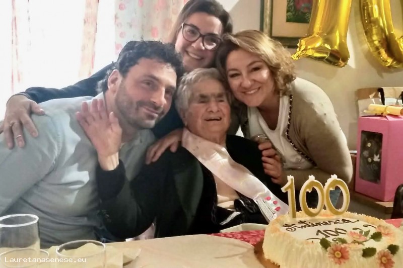 Antinesca Pasquinuzzi Borgogni, Mamma di Luciana e Vanna, festeggia i suoi 100 anni, portati bene, con i tre nipoti: