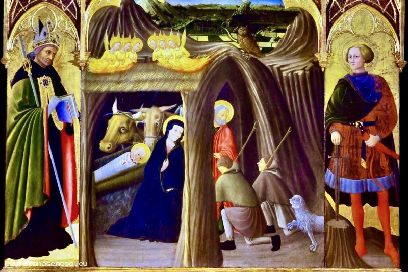 The painting presents the type of fourteenth-century blades depicting the patron saints of the Cathedral of Siena: the structure is in triptych with the central narrative scene, flanked by two saints. In the middle we can see a fresh Nativity, similar to the one painted around 1351 by Bartolomeo Bulgarini for the altar of the Cathedral of St. Victor and of which a fragment in the United States, at the Fogg Art Museum in Cambridge.