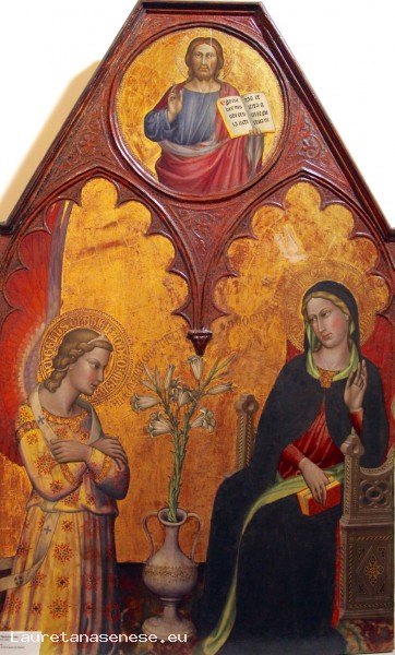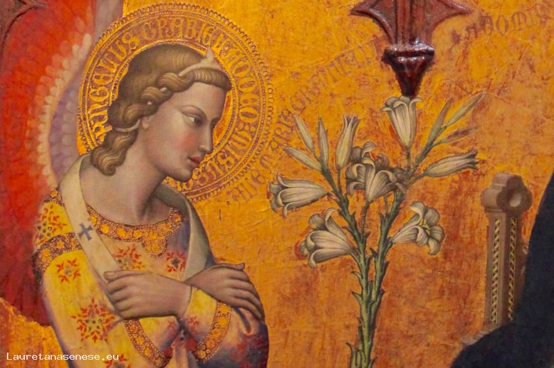 Permane invece il naturale gesto dell'altra mano, che tiene l'indice tra le pagine del libro per non perdere il segno. L'angelo, invece, tiene le braccia incrociate sul petto in segno di riverenza. Al centro, esattamente come in Simone Martini, abbiamo un vaso con i gigli, simbolo di purezza, e vediamo il saluto dell'angelo, scritto, che parte dalla sua bocca e giunge fino alla Vergine. Nel tondo in alto abbiamo la figura di Cristo in atto di benedire.
