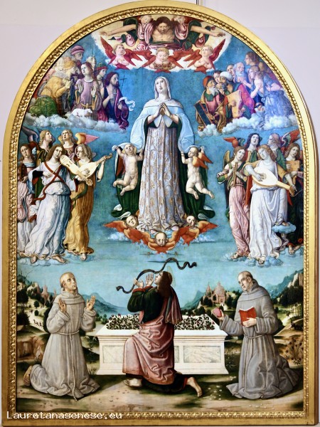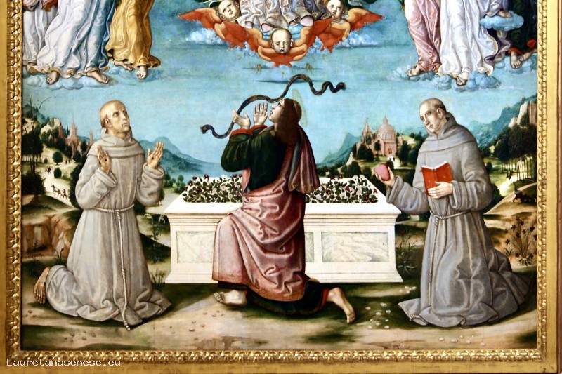 A terra, oltre ai santi Francesco d'Assisi e Antonio da Padova, visibili ai lati della tomba abbandonata, un terzo testimone osserva la scena in primo piano, diventandone involontariamente partecipe: si tratta di san Tommaso, il cui leggendario scetticismo è noto anche alla Vergine. Perciò, per fornirgli in un certo senso la prova della sua ascesa al cielo, Maria ha appena lasciato cadere la cintura che si era tolta. Questa scena è piuttosto comune in Toscana e a Siena.