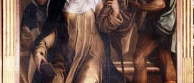 It is one of the three great scenes in the oratory of the kitchen of the Sanctuary of St. Catherine, is home to a wall flanked by two paintings done by Riccio shortly before his death and perhaps supplemented by Arcangelo Salimbeni. The right one shows Catherine offers the mantle to Jesus in the guise of a pilgrim. The work is part of the miraculous events which filled the life of Catherine and are testimony to his extraordinary spirit of charity.