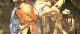Ricordata dal Romagnoli, prima del 1835, nell'oratorio di Santa Croce, dove trent'anni dopo la segnalò anche il Brogi, come opera di Francesco Nasini, la tela, che sostituì, probabilmente nel corso dell'Ottocento, la Crocifissione del Mei, appare rifarsi agli esemplari più acutamente naturalistici di Rutilio Manetti, modelli ai quali Francesco guardò con precipuo interesse nella sua fase giova¬nile.