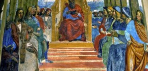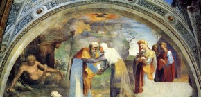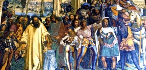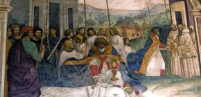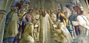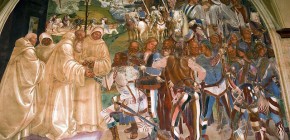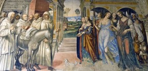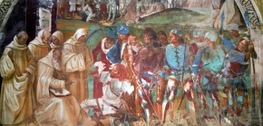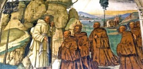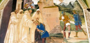 L’affresco che mostra la storia del Re Totila che vuole conoscere San Benedetto e manda a ...